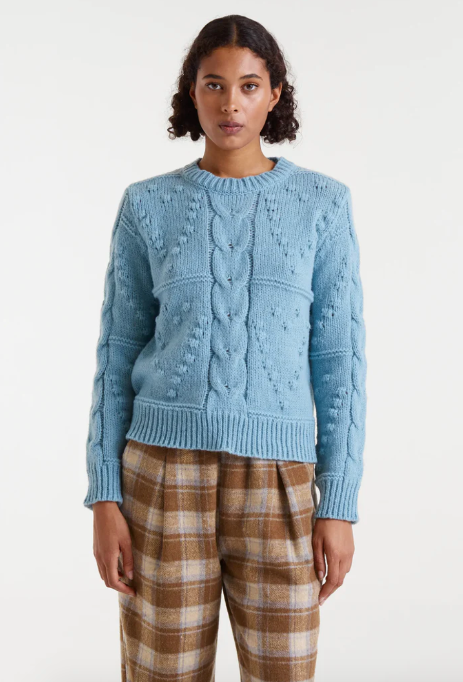 Blue cable-knit sweater with a round neck and long sleeves. Ribbed details