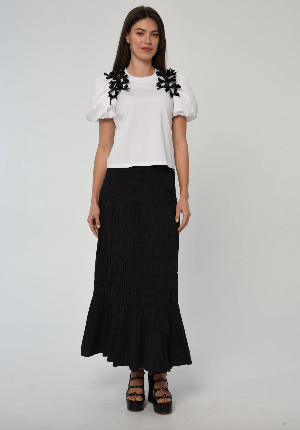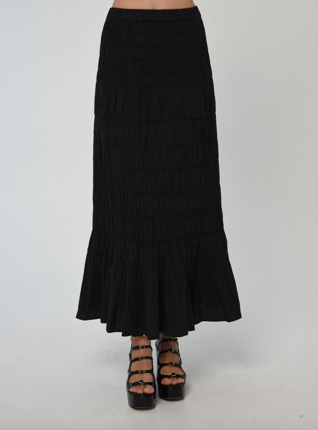 The Kelly Skirt in Black is a wardrobe staple! Designed with smocking throughout the body and a comfortable encased elastic waistband.