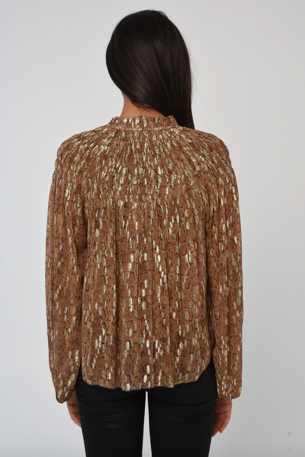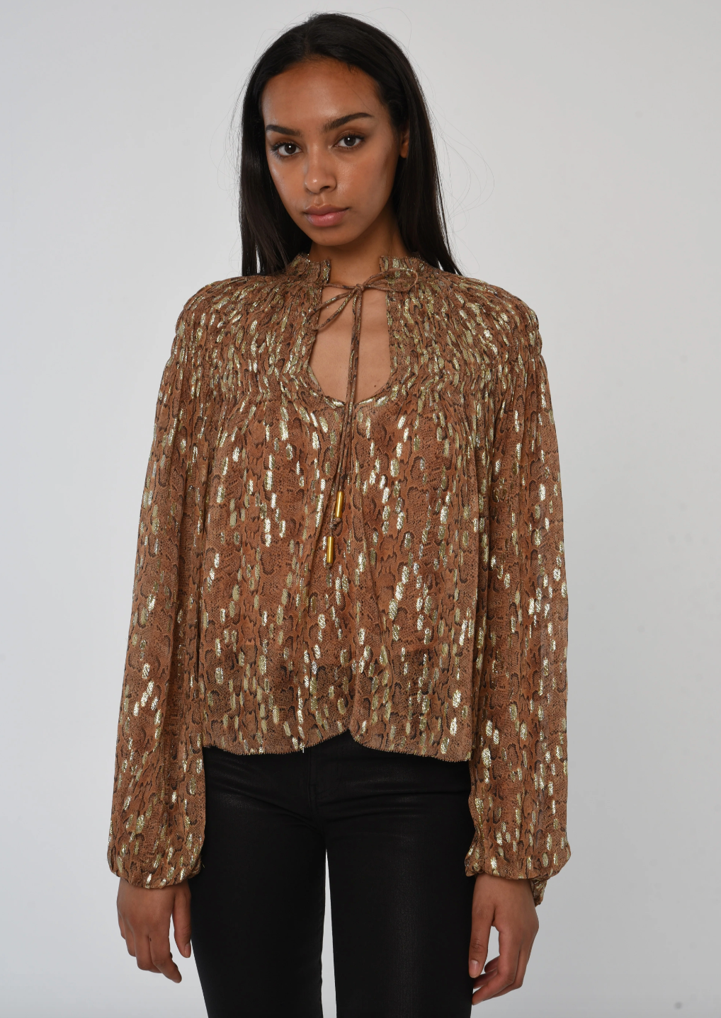 The Meredith top is back for the Holiday Season! In the Cavalier Python Print, this print has accents of gold lurex throughout it. With a center front self tie, full sleeves, and smocking at the shoulders.