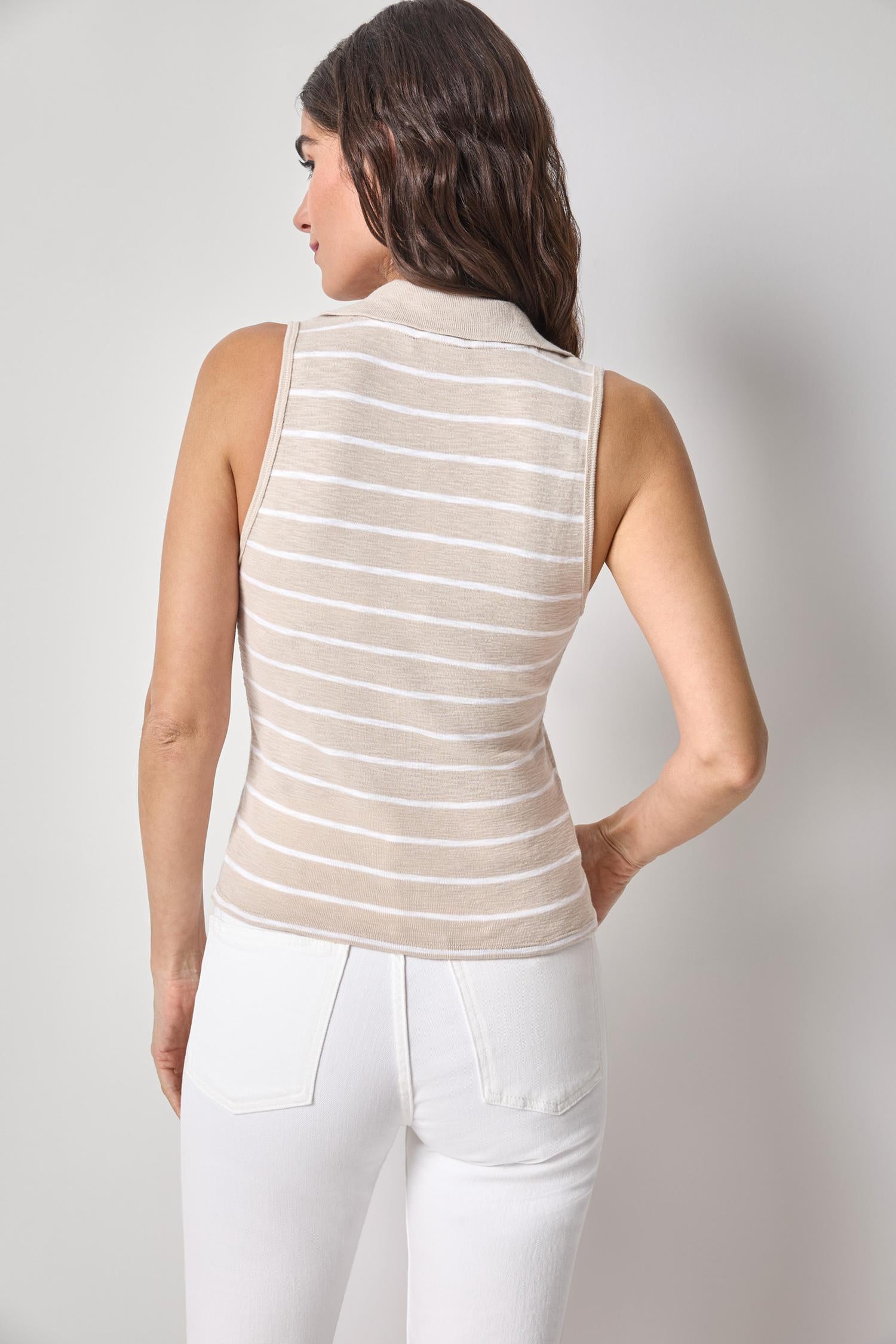 Our Striped Sleeveless Collared Top is made in our 1x1 Rib, a sturdy, medium-weight cotton fabric with a clean, refined look. Offered in classic stripe or solid white, this fitted style features a knit collar and a flattering V-neckline for a modern take on the classic preppy look. Pair it with our Cotton Linen woven bottoms or Textured Terry pieces for the perfect summer outfit.