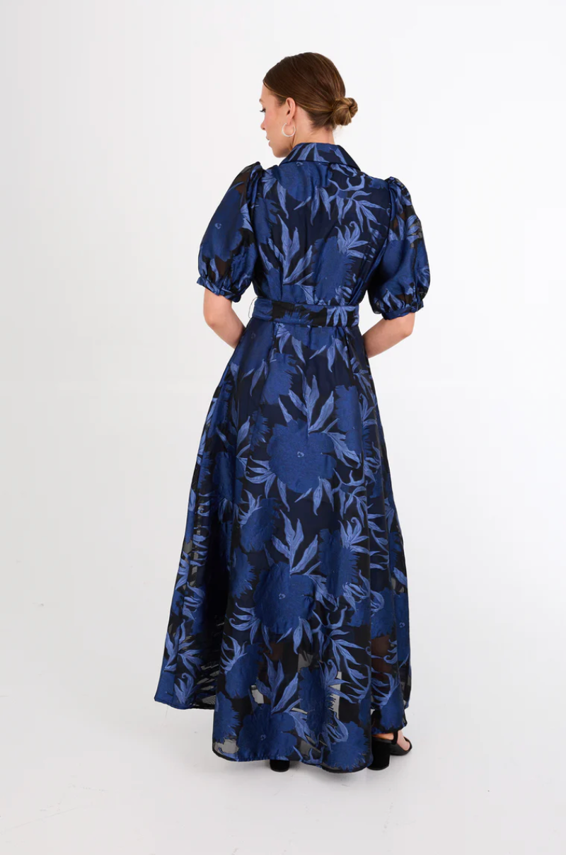 Whether you’re the mother of the bride, a wedding guest, or attending a gala, the Charlotte Gown in Regal Royal Blue and Black Florals perfectly balances playful elegance with modern sophistication. Its timeless silhouette features a black fabric backdrop adorned with striking royal blue floral accents. Style it with sparkling earrings and metallic heels for a polished, unforgettable formal look.