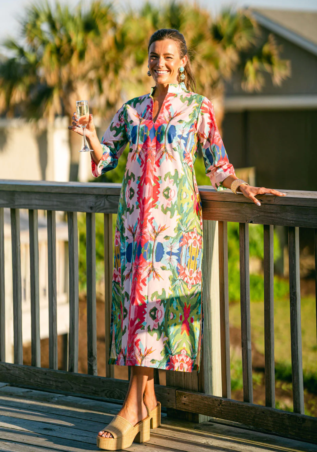 Loose fit caftan with bell sleeves, side seam slits and pockets.