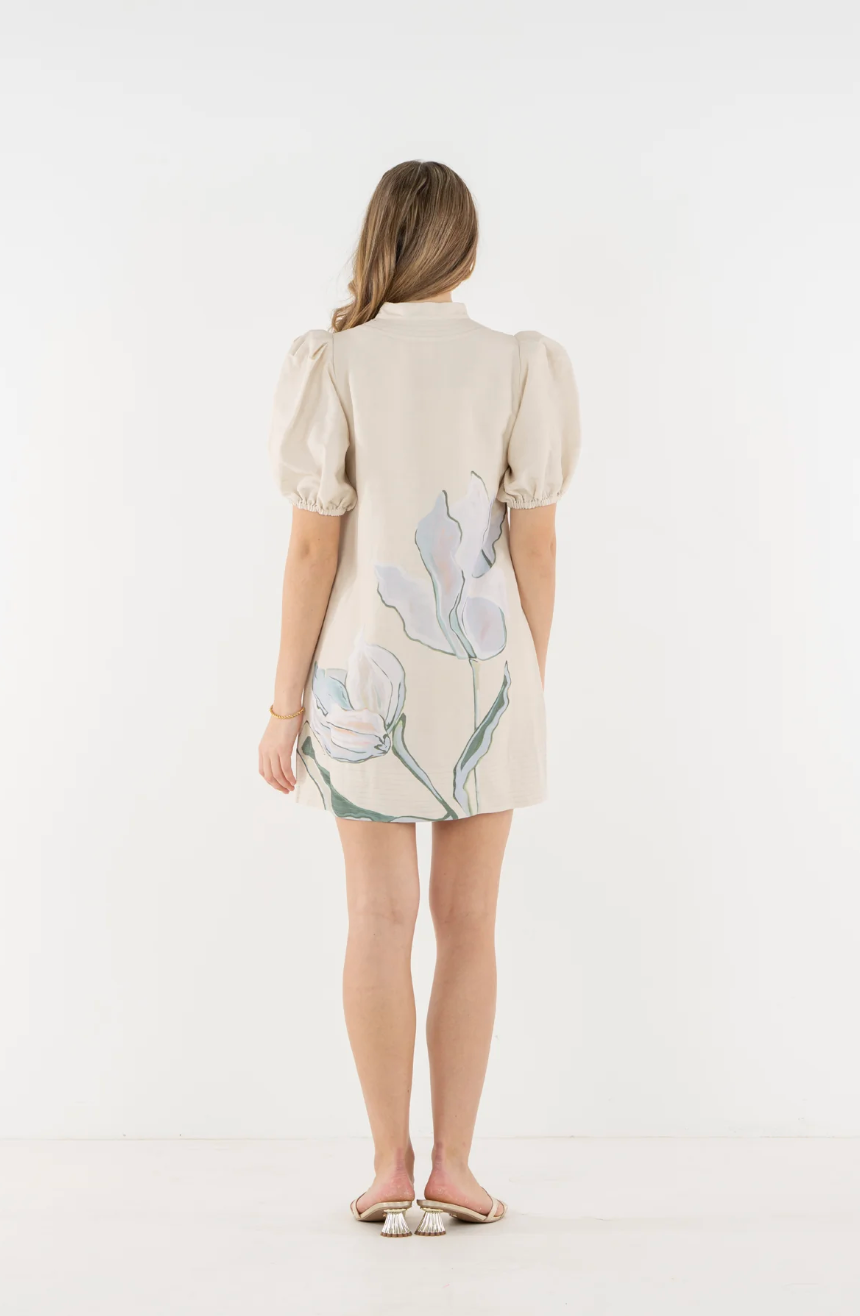 The Hampton Mini in Lavender Fields features a mandarin-style collar, elastic puff sleeves, and functional side pockets, finished with a softly tailored silhouette that offers shape without clinging. Designed in collaboration with artist Jessica O’Neill, the Lavender Fields print translates a hand-painted canvas of gentle florals into a wearable design, bringing a sense of softness and artistry to this signature mini silhouette.