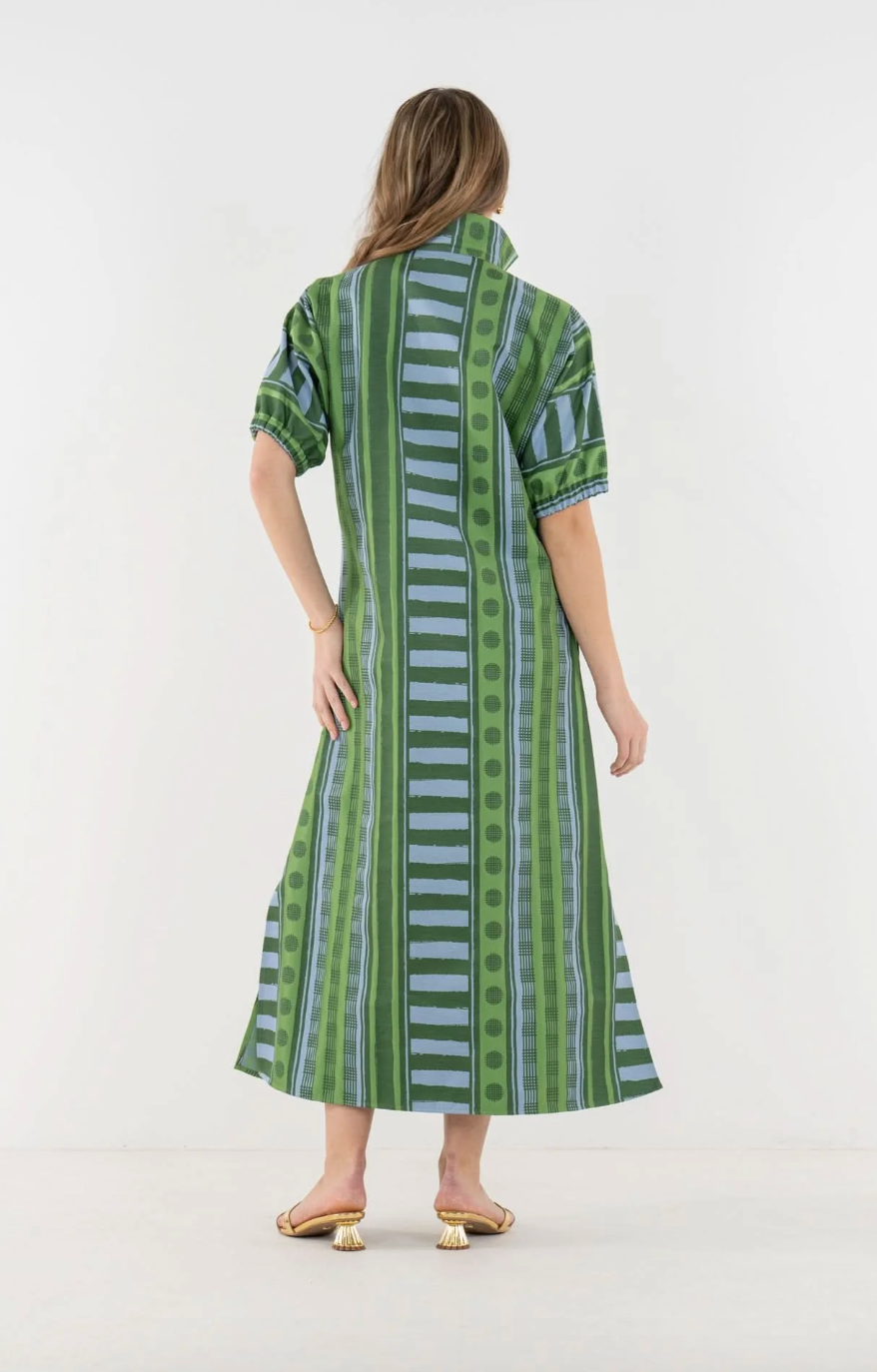 Featuring a classic stand collar accented with striped trim, the Poppy Maxi in Forest Jubilee is balanced by loose elastic dolman sleeves and a relaxed maxi-length silhouette. Side slits at the hem add movement and ease, enhancing the fluid shape. Printed on a luxe jacquard fabric, Forest Jubilee offers gentle structure with a subtle sheen that elevates the overall look. Equally suited for special occasions or styled casually with sneakers, this dress delivers refined versatility with a joyful edge.
